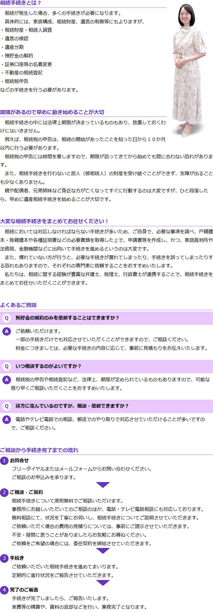 相談者の方のご事情をしっかりと伺った上で、必要となる相続手続きの流れや今後の見通しなどについてアドバイスさせていただきます。